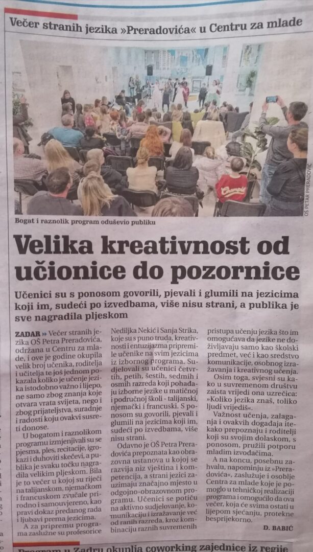 U svečanom i radosnom ozračju održana je Večer stranih jezika OŠ Petra Preradovića, koja je ove godine upriličena u prostoru Centra za mlade, 25. veljače u 18.00 sati. Ovaj poseban događaj okupio je velik broj učenika, roditelja i učitelja te još jednom pokazao koliko je važno i lijepo učiti strane jezike.
